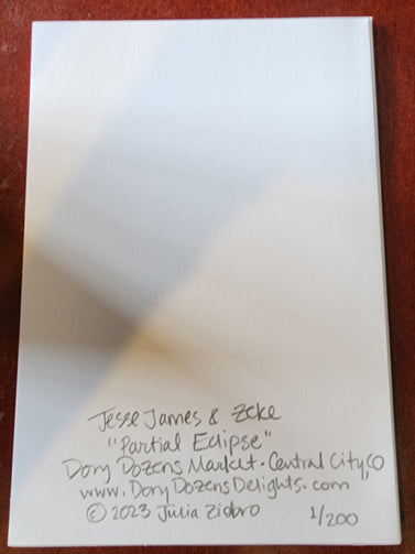 Jesse James photobombed Zeke and the result is this Partial Eclipse. Blank high quality notecard with an actual 5" x 7" photo on the front, these are signed and are in a limited edition of 200, numbered on the back.